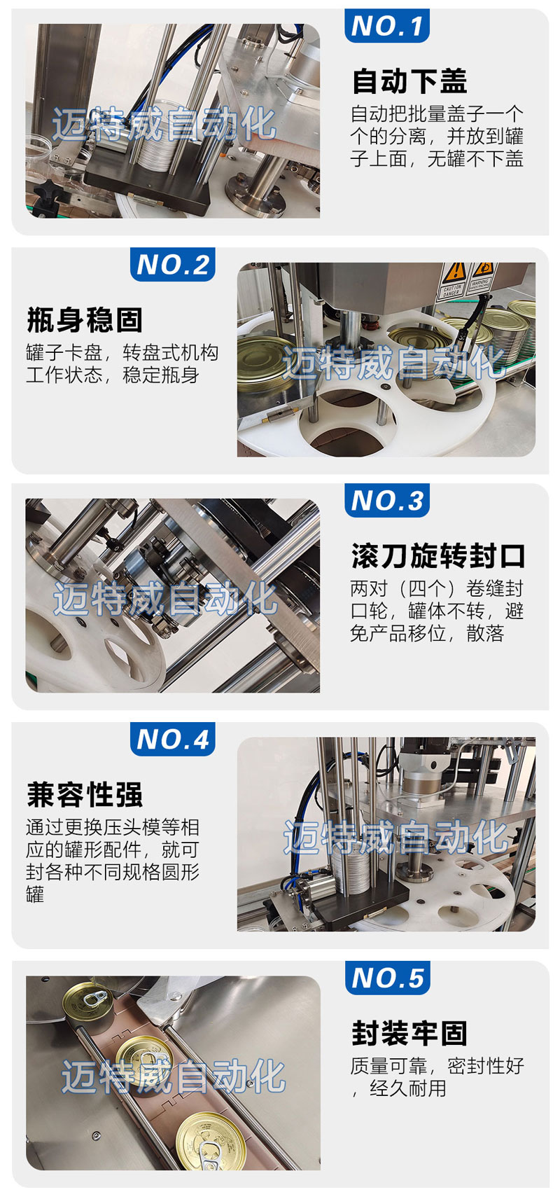 ● 本機具有兩對(四個)卷縫封口輪,卷封時罐身固定式的全自動封罐設備;