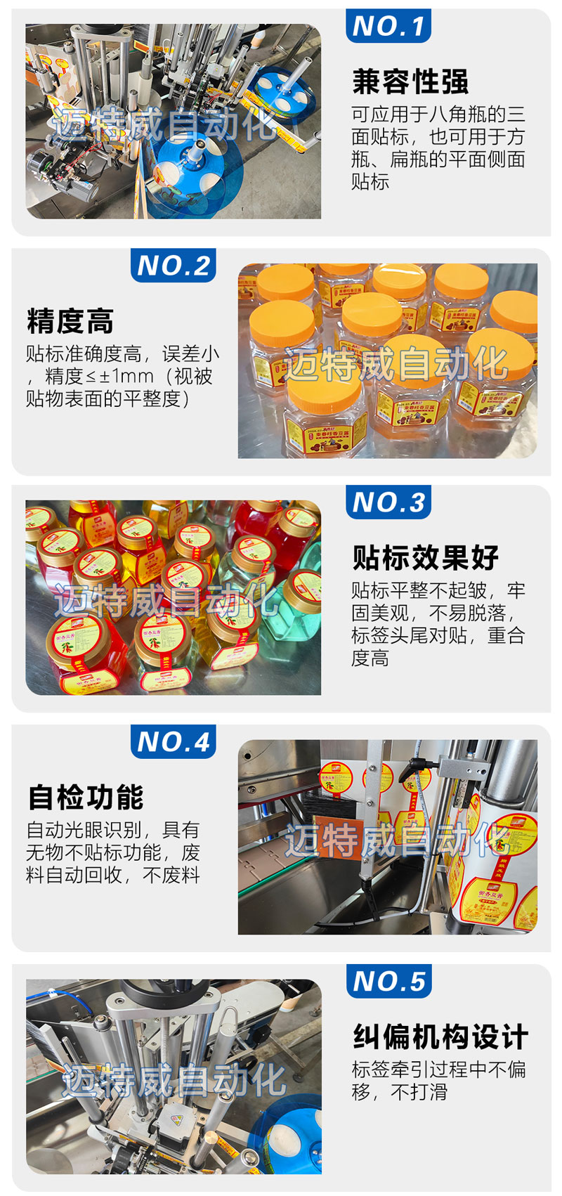 這款單面貼標(biāo)機(jī)針對(duì)客戶需求設(shè)計(jì),可應(yīng)用于八角瓶的三面貼標(biāo),也可用于方瓶、扁瓶的平面?zhèn)让尜N標(biāo),兼容性強(qiáng)。