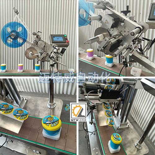 這款平面貼標(biāo)機(jī)是針對(duì)這種特殊瓶設(shè)計(jì)定制的,輸送帶上加定位模具,固定產(chǎn)品,平面貼標(biāo),精度更高。