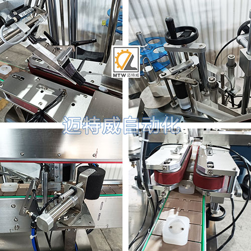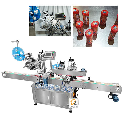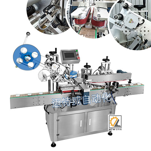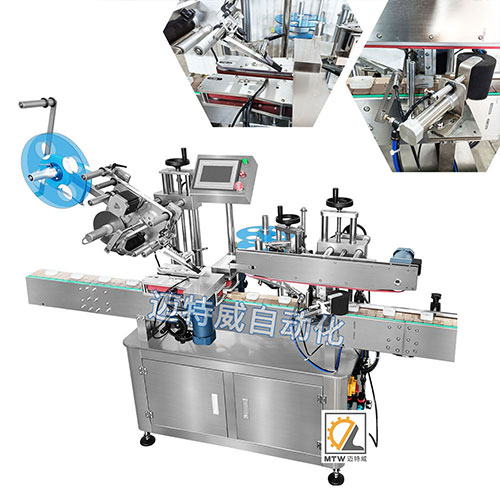 這款平面+側面貼標機為特制機器,共有兩個貼標頭:一個貼標頭在頂部,另一個貼標頭在側面,它可以給瓶子、罐子貼上2張標簽,一張貼在頂部,另一張貼在側面。模具固定產品,運行穩(wěn)定