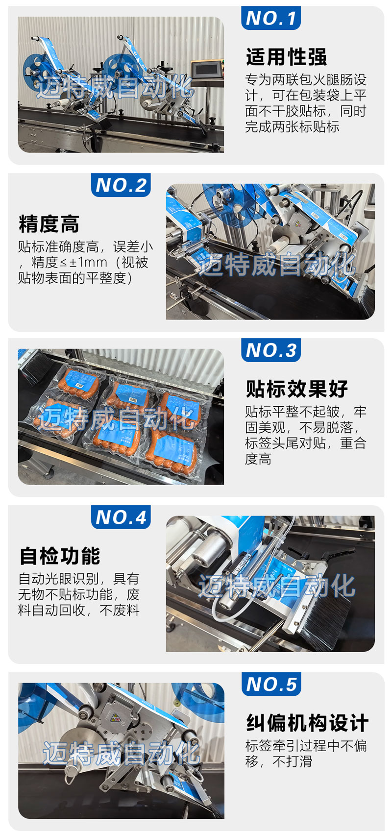 這款平面貼標(biāo)機(jī)是針對(duì)這種兩聯(lián)包火腿腸包裝定制的,平面貼標(biāo),精度更高。
