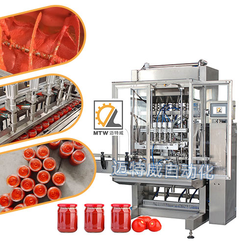 醬料灌裝機(jī)采用伺服活塞灌裝機(jī)灌裝,活塞缸體控制灌裝量,灌裝準(zhǔn),誤差小,灌裝量可在100-1000、200-2000、500-5000ml范圍內(nèi)任意選擇調(diào)整,適用于不同瓶型的醬料在線自動(dòng)灌裝。
