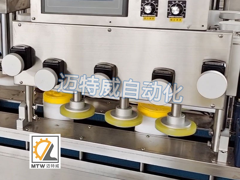 ● 三組搓蓋輪設(shè)計成從高到低的階梯式,以保證瓶蓋和瓶口螺紋絞合的不同水平位置都有搓蓋動作,確保每個瓶蓋和瓶子都鎖到位;