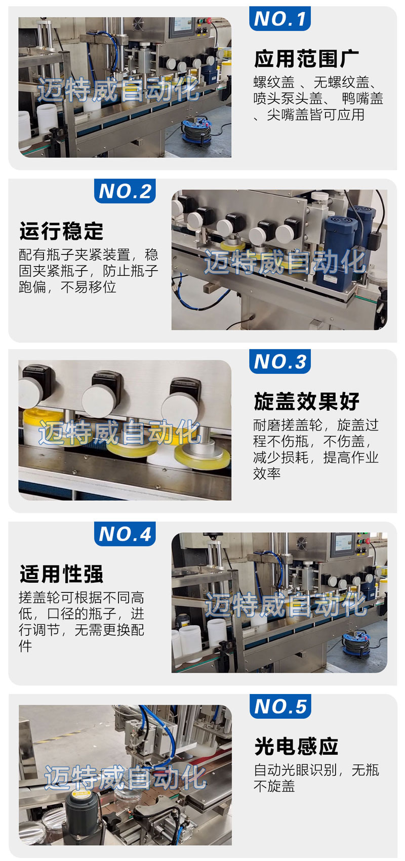 應(yīng)用行業(yè):該旋蓋機適用于醫(yī)藥、日化、食品、酒水、飲料、糧油等行業(yè)的塑料螺紋蓋、泵頭蓋上蓋和旋蓋。